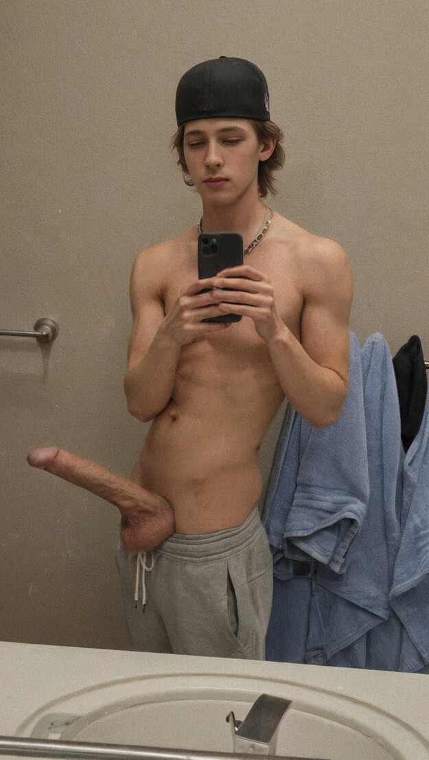Cute slender blond releases a geyser onto his chest
